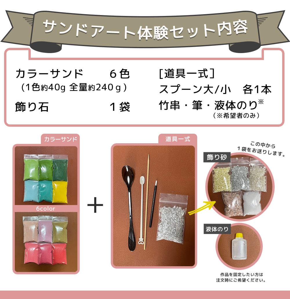【砂6色+道具一式】をセットでお届け。(ポスト投函)