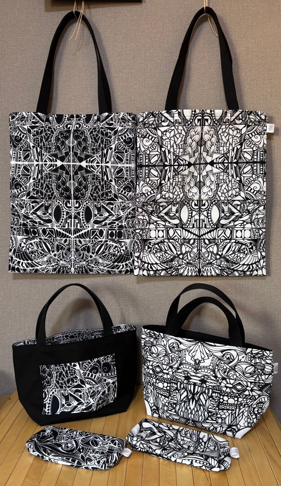 独創的な「momotangle」のアートを、職人による丁寧な仕立てでバッグに昇華させた、コラボレーションアイテムです(オリジナルタグ付き)